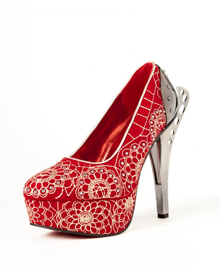 Custom embroidery on Steampunk inspired double sided custom cut metal heel, embroidery continues down to platform. Red and Black option.